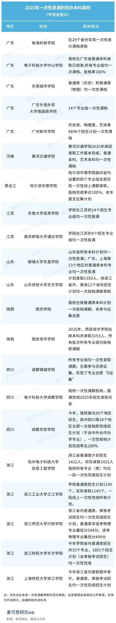 麦可思研究通过搜索各校的公开报道,梳理出一份今年在本省一次性录满的民办本科高校名单。